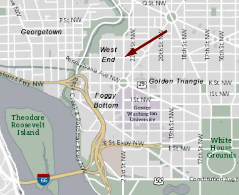 Much of the focus will relate to the West End neighborhood of Washington, D.C., which is shown in the map at left, with a red arrow.